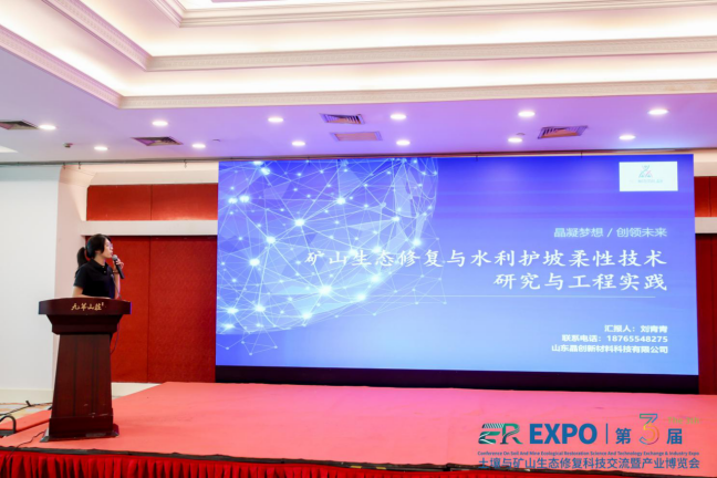 技术经理刘青青在分论坛上深入解析了《矿山生态修复与水利护坡柔性技术研究与工程实践》,重点展示了聚丙烯长丝抗冲网垫等产品在生态修复中的技术优势。