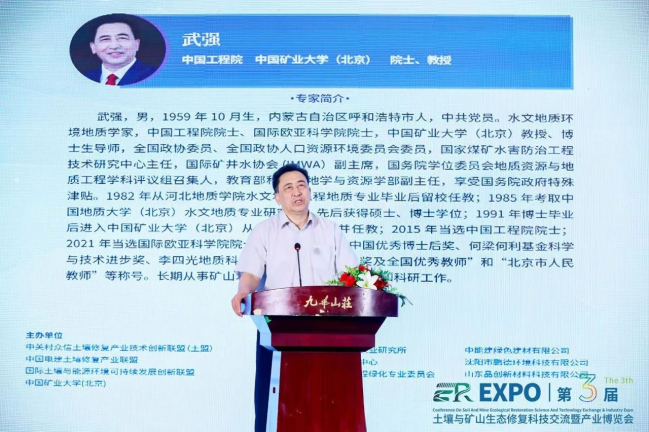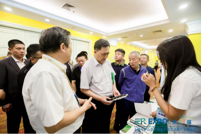 在院士论坛结束后,出席大会的院士领导专家在土盟理事长黄占斌、秘书长高杰的带领下巡展土博会。中国工程院院士、中国矿业大学(北京)教授武强,参观了山东和记官网新材料科技有限公司生态修复柔性新材料展台。并在会上围绕国土空间资源保护与利用、绿色矿山建设等方面,对尾矿综合利用、土壤修复治理、矿山光伏等做了交流发言。